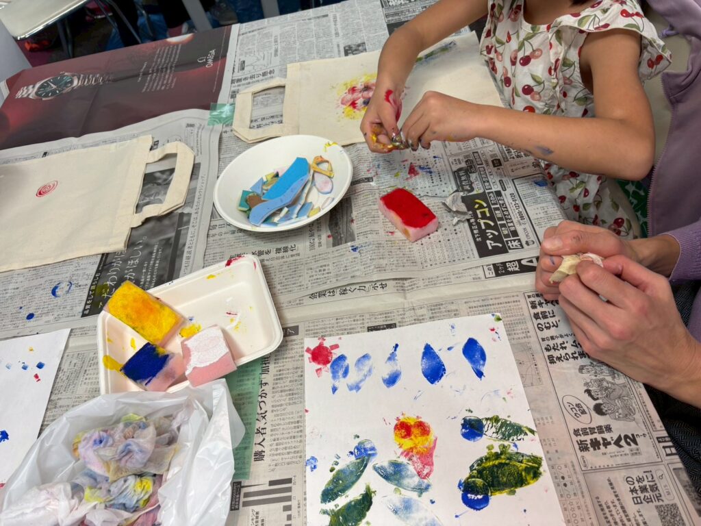 赤色のスタンプの上に黄色のスタンプを押すと「オレンジ」になるなど、色の変化も楽しめるワークショップでした。