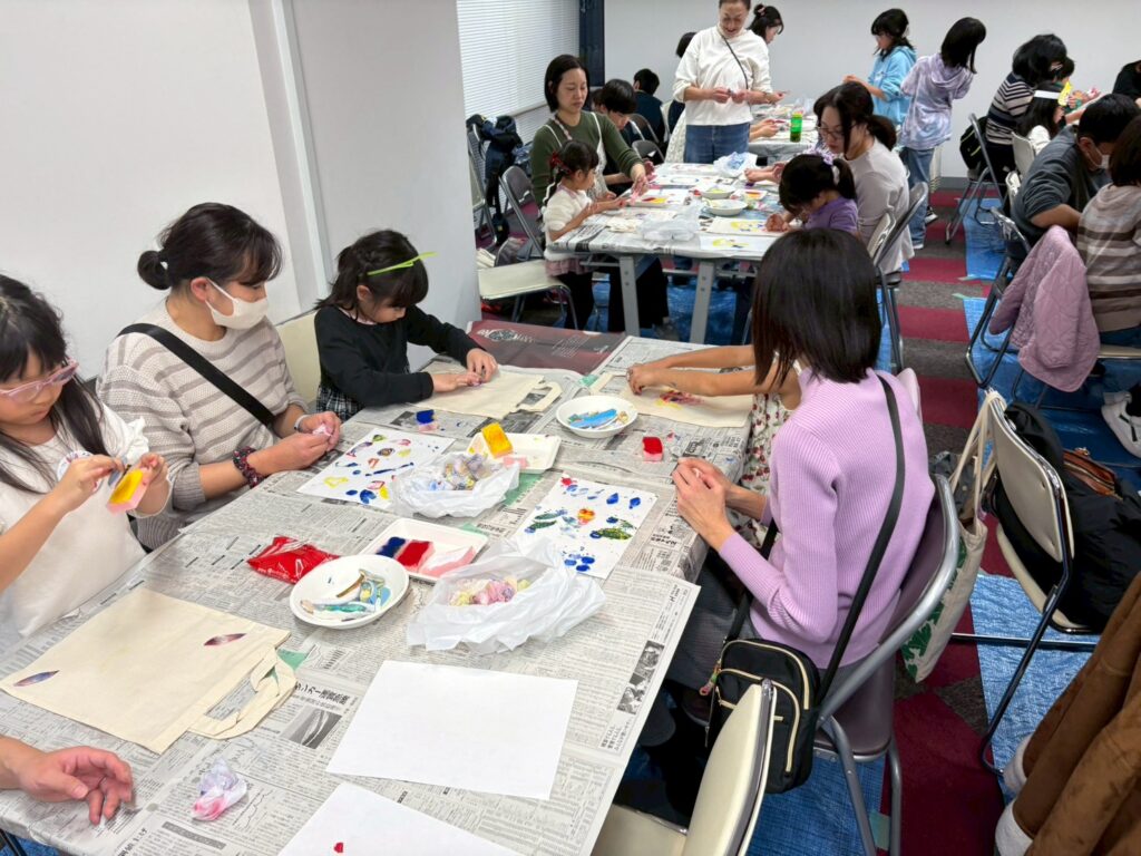 子どもたちも保護者もみんな、手が絵具まみれになるまで夢中に。