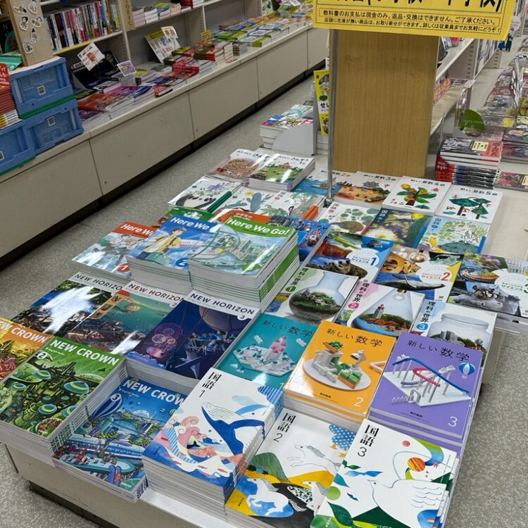教科書販売日に買えなかった生徒さんの分のみ販売終了から3日後を目安に新学期が始まるまで本店で販売します。支払いは学校同様現金のみとなります。