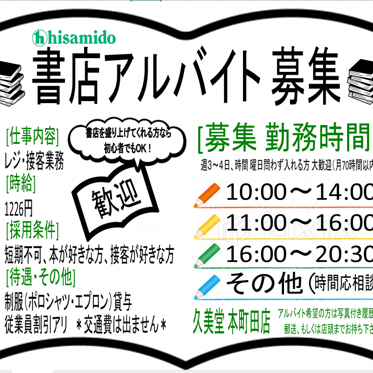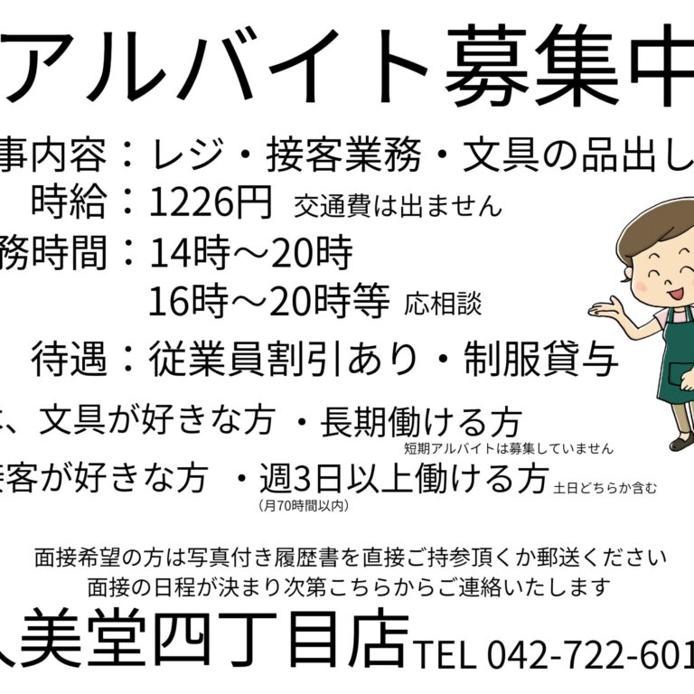 11月152025 アルバイト募集中 四丁目店 インフォメーション, 四丁目店themeadminから 募集期間 2025年11月15日~ [勤務地]久美堂四丁目店 [業務]レジ・接客・文具品出等 [待遇]制服貸与… 続きを読む